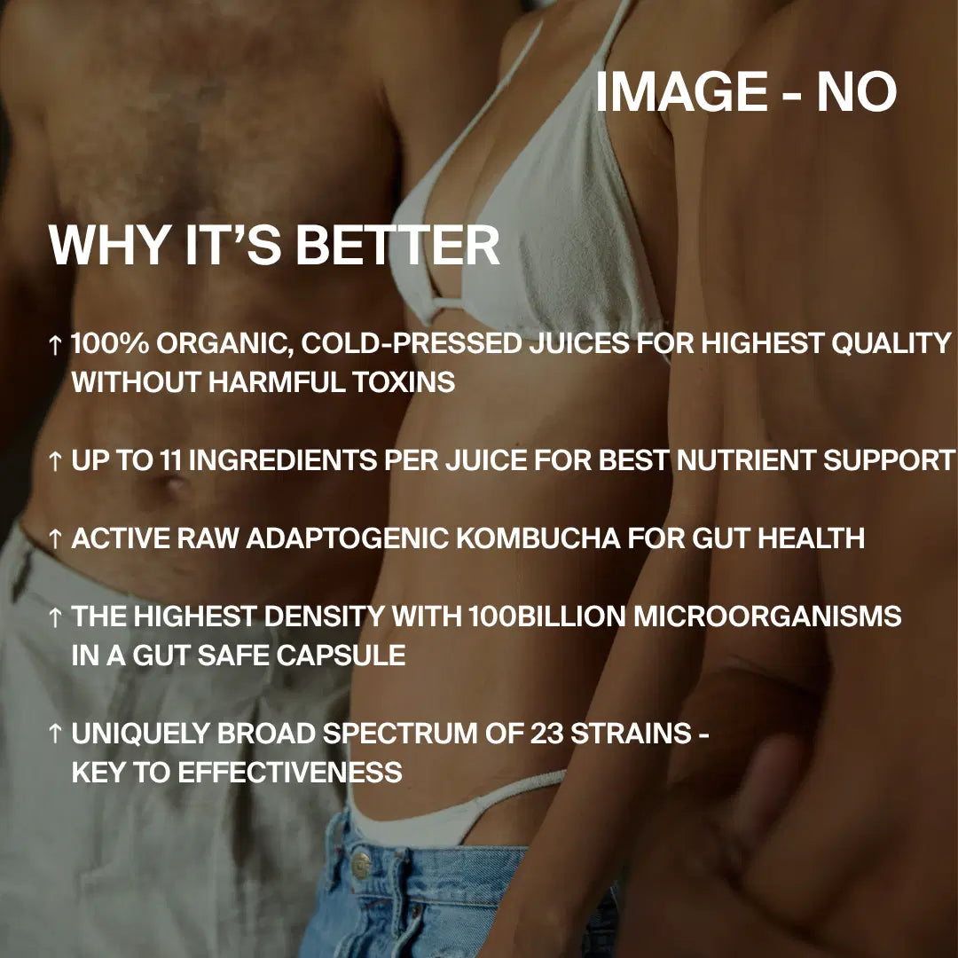 Aktiver Kombucha und Shots fördern den Aufbau nützlicher Bakterien, während bis zu 11 hochwertige Zutaten pro Saft gezielt Zellregeneration und Autophagie aktivieren. Alle Säfte sind bio, kaltgepresst und frei von Pasteurisierung oder Konservierungsstoffen – für maximale Frische und Nährstoffdichte.