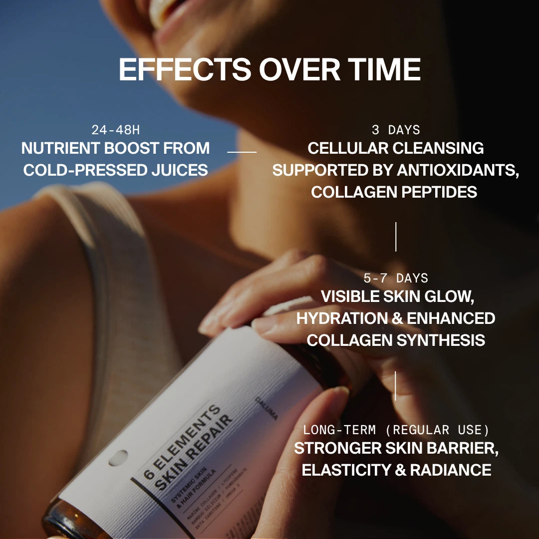 Ebenfalls gibt es zur fortführenden Unterstüzung der Haut- und Haarregeneration 1x 6 Elements Skin Repair als Teil des BETTER SKIN Bundles dazu. Das Supplement darf erst nach Abschluss der Saftkur eingenommen werden.