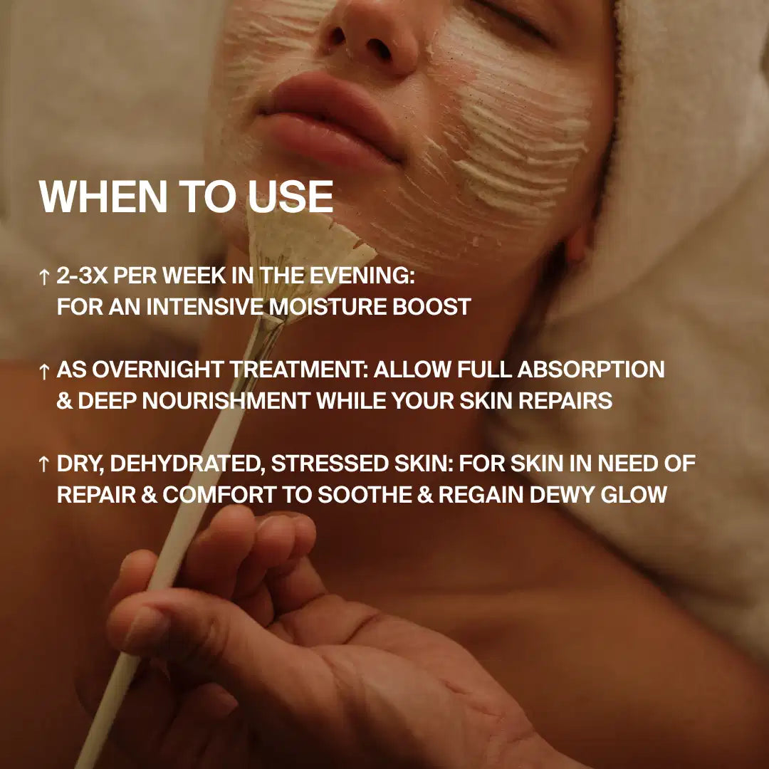 Die Feuchtigkeitsmaske wurde entwickelt, um trockene und empfindliche Haut tiefenwirksam zu pflegen und ihr einen frischen, gesunden Glow zu verleihen. Sie spendet intensiv Feuchtigkeit, beruhigt gereizte Stellen und stärkt die natürliche Hautbarriere – perfekt als täglicher Glow Booster oder nährende Overnight Maske.