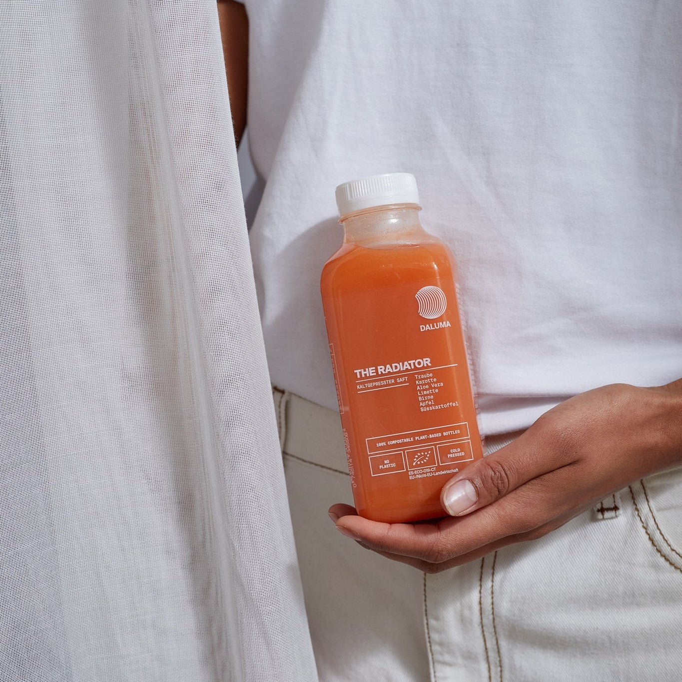 Der Radiator Glow Saft ist bio, kaltgepresst und frei von Pasteurisierung, um alle Nährstoffe und Enzyme zu bewahren. Nachhaltig abgefüllt in bio-kompostierbaren Flaschen, steht er für bewussten Genuss ohne Zusatzstoffe.